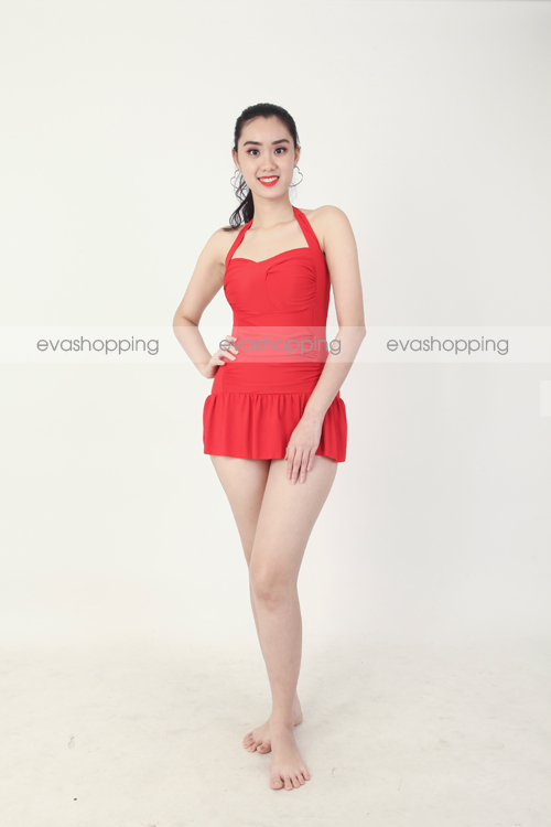 Bộ bikini một mảnh đỏ quyến rũ phù hợp với những cô nàng có vóc dáng nhỏ ngọn. Thiết kế áo quây ngực, cổ áo cột ra sau, vừa khoe được phần lưng gợi cảm, vừa tôn lên vòng 1 căn đầy của nàng. Kiểu dáng liền thân với đuổi váy xòe giúp bạn che khuyết điểm ở vùng bụng đồng thời khéo léo trình diễn đường cong của cơ thể.